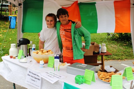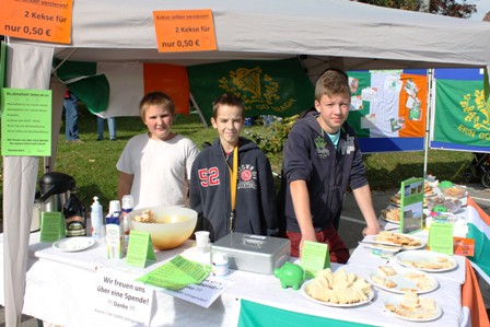 Der Verkauf bzw. die Spendenaktion ist gut gelaufen. Wir haben das Brot als Probiererle mit Butter oder Schmalz angeboten. Dazu haben wir Irischen Tee und Kaffee angeboten, mit Whisky oder Baileys. Immer mal wieder sind wir mit einem Teller auf dem Fest herum gelaufen und haben unsere selbstgemachten Produkte angeboten. Nebenbei haben wir über unser Vorhaben – die Reise nach Irland – berichtet. An die Kinder haben wir Kekse verkauft, die sie selber mit weißem oder grünem Guss bestreichen und dekorieren durften. Zwei Stück haben 50 Cent gekostet. Außerdem konnte man an unserem Stand Schäfchen aus Papier basteln.