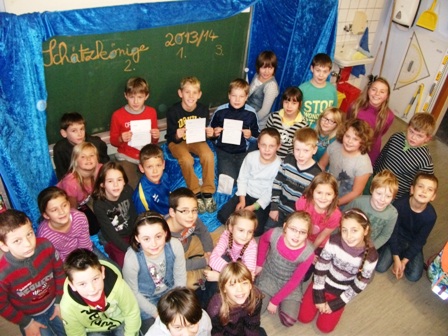 Nach der Auszählung in der Klasse 4b darf sich nun Fabienne aus der Klasse 3 ab jetzt mit dem Titel „Schätzkönigin 2013/2014“ schmücken. Sie teilt sich ihren Platz mit ihrer Klassenlehrerin Frau Schmidt-Auginski.