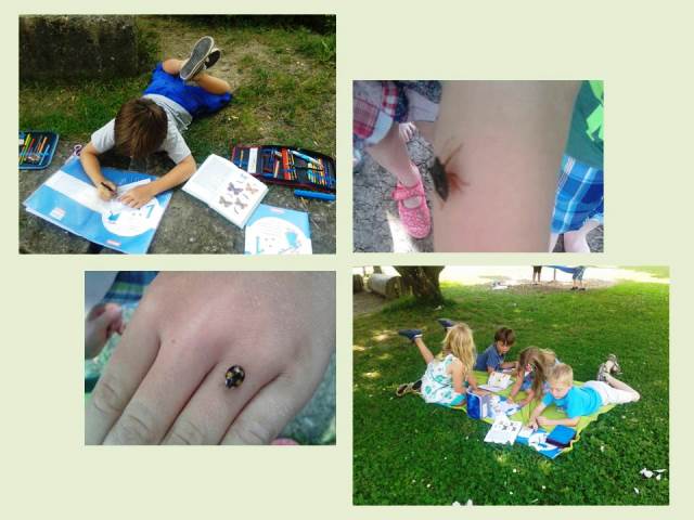 Wegen der heißen Temperaturen, aber auch passend zu unserem neuen Thema „Die Wiese“ fand der MeNuK-Unterricht in den letzten zwei Woche hauptsächlich im Freien statt. Nachdem fleißig Gräser und Wiesenblumen gesammelt und bestimmt wurden, beschäftigten sich die Kinder mit Schmetterlingen und Marienkäfern. Ab und an krabbelte und flog auch mal das ein oder andere Tier direkt über das Lapbook.