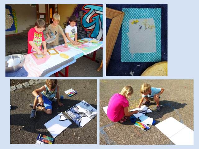 Nachdem die Papierschöpf-Aktion in der Ganztagsbetreuung ein voller Erfolg war, erhielten auch die beiden ersten Klassen die Möglichkeit Papier selbst herzustellen. Wer nicht schöpfte, schwang den Pinsel und malte fantasiereiche „Schattenbilder“.