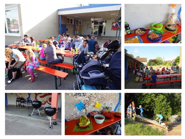 Am Donnerstagnachmittag fanden sich die Kinder der Klasse 1a, mit ihren Familien, zu einem gemütlichen Sommerfest im Schulhof der Schule ein. Nachdem die Papas die vielen Grills entzündet hatten, begann das Fest mit einer kleinen Überraschung. Die Kinder präsentierten ihren Eltern ein Sommergedicht, unterstütz mit selbst gemalten Bildern. Aus dem Englischunterricht sangen sie fröhlich ein Lied, bei dem auch die Eltern bei der Zugabe mit einstimmten. Mit viel guter Laune wurde das Buffet geplündert und fröhlich auf dem Schulhof gespielt.