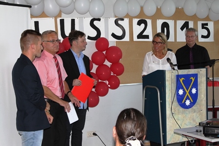 Claudia Schäfer von der Kreissparkasse Rottweil überreicht den Wirtschaftspreis an Philipp Eberhard (li.), unter den Gratulanten Bürgermeister Karl-Heinz Bucher, Schulleiter Rainer Kropp-Kurta und Klassenlehrer Torsten Zühlsdorff