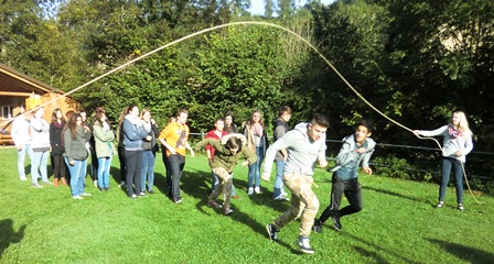 Seile markieren einen großen Säuresee, in dessen Mitte auf einer kleinen Insel ein Schatzbeutel steht. Natürlich muss jede Berührung mit der aggressiven Flüssigkeit unbedingt vermieden werden. Zudem soll die Gruppe rund um das „Wasser“ nonverbal agieren, was die Sache nicht einfacher macht. Außerdem stehen den Jugendlichen Seile, Karabiner und ein Klettergurt zur Verfügung. Kann die Gruppe den Schatz nun heben? Erstaunlich schnell ist das Problem gelöst. Mit gebündelten Kräften wird das lange Seil auf Spannung gehalten, während sich Thomas mit Hilfe des Klettergurts und der Karabiner zum Beutel herüberhangelt. Der süße Inhalt ist dann rasch Geschichte…