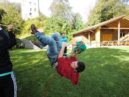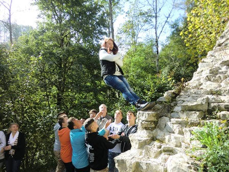 Doch damit nicht genug. Das „Sahnestück“ des heutigen Tages wartet natürlich am Schluss. Herr Schwarz führt uns zu Mauerresten der Ruine und erklärt das nächste Angebot. Wer möchte, darf gleich einen kleinen Vorsprung in etwa zwei Meter Höhe erklimmen. Mit dem Rücken zum Abgrund soll man sich dann so steif wie ein Brett machen, die Arme verschränken und vertrauensvoll nach hinten fallen lassen. Zehn ausgesuchte Mitschüler bilden zuvor unten ein Spalier und fangen die fallende Person auf. Klingt relativ einfach, stellt für die mutigen Springer aber eine enorme Überwindung dar. Immerhin müssen Angst und die „Tu das nicht!“-Stimme ignoriert werden. Dazu kommt noch die bange Frage, ob mich die anderen tatsächlich sicher fangen können. Wer sich diesem „Wahnsinn“ stellt, durchlebt ein Wechselbad der Gefühle. Denn nur einen Augenblick später wird die Angst durch ein sagenhaftes Glücksgefühl abgelöst: ich habe es geschafft!