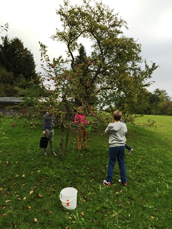 Die 5. und 6. Klässler machten sich um 8.30 Uhr mit Eimern bewaffnet auf, um die drei Apfelbäume abzuernten. Nach einer Stunde machten wir uns mit ca. 40 Kilogramm geernteten Äpfeln wieder auf den Rückweg zur Schule. Aufgrund einer großzügigen Apfelspende der Familie Reiser aus Dietingen beläuft sich unser Gewicht an Äpfeln zurzeit auf ca. 140 Kilogramm.