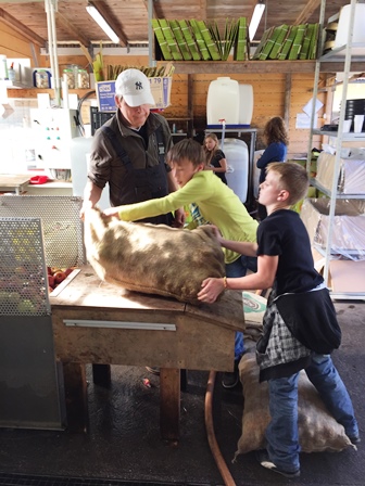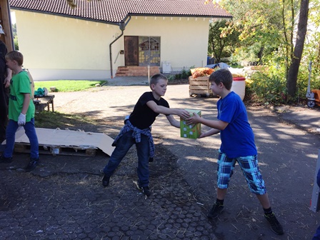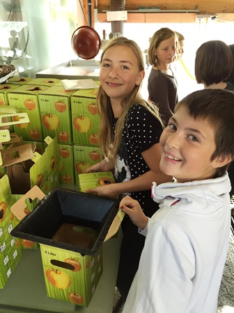 Nachdem die letzten Tage immer mehr Apfelspenden in die Schule gebracht wurden und wir am Mittwoch Abend insgesamt 800 Kilogramm Äpfel im Raum der Pausenspielausleihe gelagert hatten, ging es am Donnerstag morgen endlich in die Mosterei, um aus den Äpfeln leckeren Bio-Apfelsaft zu gewinnen. Zwei Fahrten mit dem Anhänger waren nötig, um alle Äpfel nach Zimmern zu bringen. Dort angekommen, machten wir uns sofort ans Werk und luden die Äpfel ab. Das sehr freundliche Team der Mosterei teilte die Schülerinnen und Schüler an die verschiedenen Stationen ein. Jeder Schüler durfte an den einzelnen Stationen mitarbeiten und erhielt so einen Einblick, wie aus dem Apfel der Apfelsaft gewonnen wird. Eine Schülergruppe lud die Äpfel ab und warf sie in die Presse, die andere bereitete die Kartons für die Abfüllung vor und die letzte Gruppe füllte den Saft in die Plastiktaschen, um sie anschließend in den Kartons zu verpacken. Auch bei der Verwertung des Pressabfalls konnten die Schülerinnen und Schüler helfen, indem sie dem örtlichen Jäger halfen, diesen auf den Anhänger zu schaufeln.