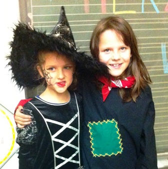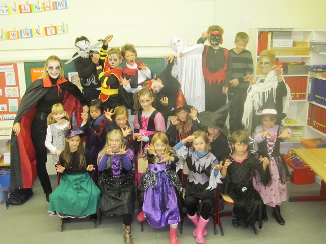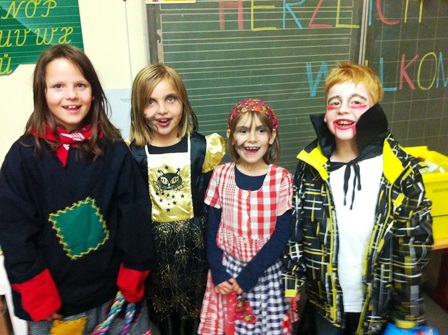 Die Schüler durften sich dem Motto entsprechend verkleiden und so spukten unter anderem kleine Hexen und schaurige Gespenster durch das Gebäude. Zuerst wurden kleine Krepppapiergespenster gebastelt, die mittlerweile die Klassenzimmer schmücken.