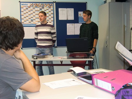 Beiden Ausbildungsbotschaftern gefällt auch bei diesem Berufsbild die Vielseitigkeit und Abwechslung im Alltag. Zusammen mit den Schülerinnen und Schülern arbeiten sie mit Hilfe von Plänen, Skizzen und Preistabellen ein Kundenangebot aus. Dabei wird deutlich, dass auch Industriekaufleute nur mit Wasser kochen. „Einiges können wir schon aus unserem Matheunterricht“, stellt eine Schülerin befriedigt fest. Andere Klassenkameraden müssen allerdings sichtlich beißen und kommen nur mit Hilfestellungen voran. Schumpp und Finkbeiner führen aber auf eine sehr sympathische Weise durch die Aufgaben, sodass niemand auf der Strecke bleibt. Nach einer lebhaften Fragerunde besteht nun wieder die Möglichkeit, bei einer Betriebserkundung tiefere Erkenntnisse vor Ort zu gewinnen. Großer Dank geht an SK Scheidel als einem der wichtigsten Partner für das Konzept der „Regionalen Ausbildungsbotschafter“.