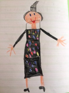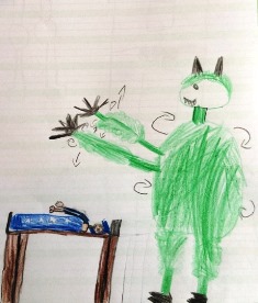Ich fand die Geschichte gut vom Teufel. Da ist passiert, dass ein Mädchen vom Teufel geträumt hat und da stand er vor ihrem Bett. Er schwang seine langen Beine und seine langen Arme. Dann drehte er sich und dann wacht sie auf. Sie geht zu Papa und Mama.