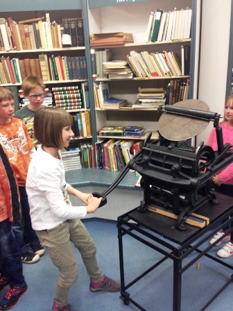 Dort haben wir erfahren, wie viele Schritte nötig sind, um aus einem einzigen Buchstaben ein ganzes Buch entstehen zu lassen. Wir durften sogar selbst als Buchdrucker ans Werk gehen. Außerdem hatten wir natürlich genügend Zeit, um uns in der Buchhandlung umzuschauen.