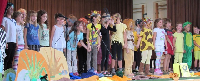 Die Feierlichkeiten fanden ihre Fortsetzung in der Turn- und Festhalle, wo die Zweitklässler unter der Leitung der Klassenlehrkräfte Katharina Schleich und Raphael Meißner ein Schauspiel zur Aufführung brachten. Der starke Löwe wollte seiner Löwen-Freundin einen Brief schreiben, doch er konnte nicht schreiben.