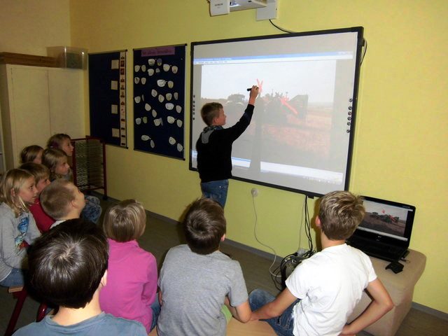 Im Sachunterricht beschäftigt sich die Klasse 3b im Moment mit der Kartoffel. Da ist natürlich auch das interaktive Whiteboard, das in den Sommerferien in diesem Klassenzimmer installiert wurde, im Einsatz. Hier wird die Funktionsweise eines Kartoffelroders durch einen kurzen Film veranschaulicht und von einem Schüler nochmals erklärt.