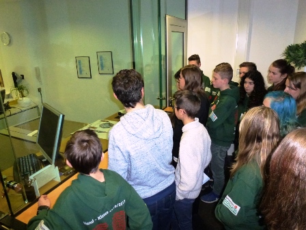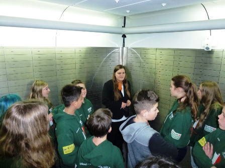 Auf der anschließenden Führung beeindruckte uns die schusssichere Scheibe hinter der das Bar- und Goldvermögen der Bank gelagert ist.