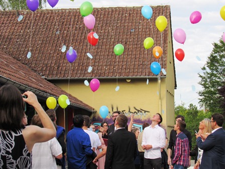 Viele gute Gründe also, auf die Abschlussklasse 2017 anzustoßen. Bei einem kalten Buffet, ausgerichtet von den an der Schule verbleibenden 26 Neuntklässlern und den Lehrerinnen Ines Hetzel und Birgitt Schlieter klang eine stimmungsvolle Feier aus und die 50 Entlassschüler ließen ihre guten Wünsche für die Zukunft an Luftballons in den Abendhimmel schweben.