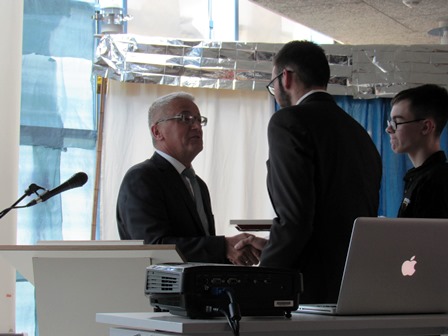 Bürgermeister Karl-Heinz Bucher gratuliert den mehrfachen Preisträgern Robert Erk und Justin Holzer