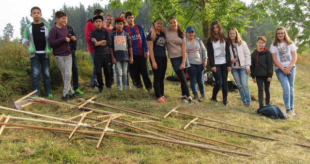 Die Umweltschutzgruppe Villingendorf hatte das Magerrasenbiotop gemäht, so dass die Helfer, nach einer kurzen Arbeitseinweisung, das Heu zusammenrechen konnten.