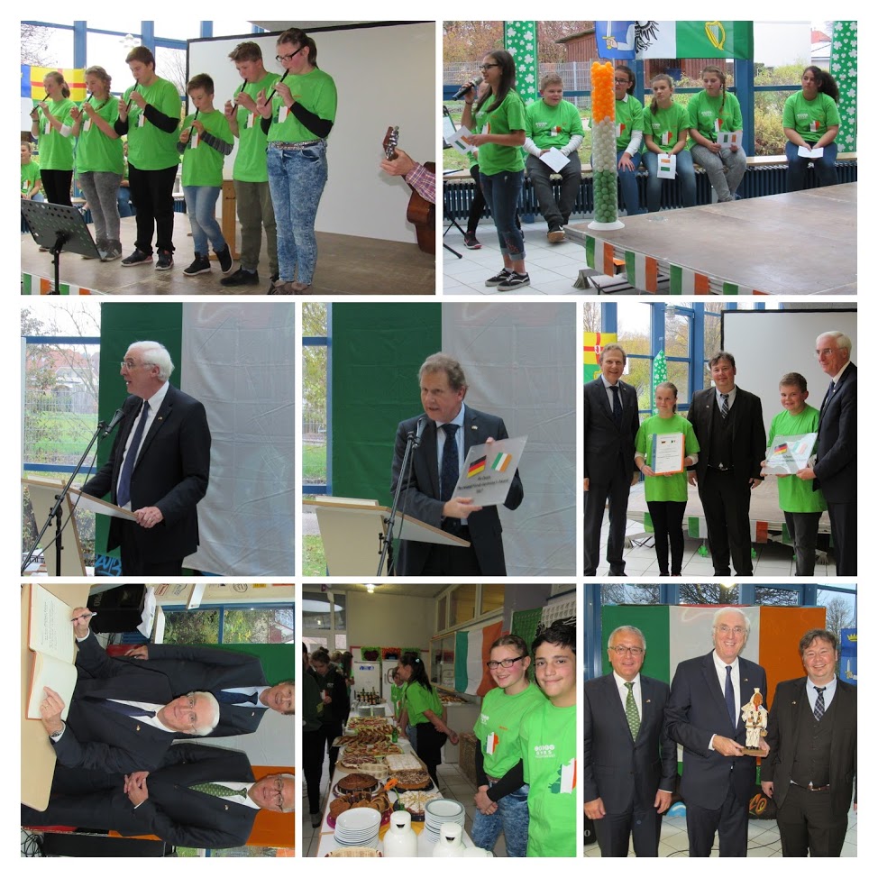 S.E. Botschafter Michael Collins besuchte am 9. November 2017 die Grund- und Werkrealschule Villingendorf. In einer Feierstunde präsentierten die 35 Siebtklässler der sogenannten Irlandklasse mit ihren Klassenlehrerinnen Konrektorin Eugenia Remisch und Birgitt Schlieter ihr Unterrichtsprojekt. Eingeleitet von irischen Segenswünschen stellten die Schülerinnen und Schüler ihre Schülerfirma, mit der ein Großteil einer Reise nach Irland erwirtschaftet wird, in amüsanten szenischen Darstellungen vor. Aber auch im Unterricht sei die „Irlandklasse“ tief verwurzelt, in Deutsch würden so Berichte verfasst, in Mathematik beispielsweise Reisekosten kalkuliert und in Englisch Konversation geübt. Fächerübergreifend würden die personalen und sozialen Kompetenzen vertieft und Teamgeist geschaffen. Mit wertvollen Partnern wie der Volksbank Rottweil eG und deren bei finanziellen Fragen unterstützenden Auszubildenden, der Landmetzgerei Digeser mit den Irischen Wochen und weiteren Unterstützern und Sponsoren sei hier ein wertvolles Netzwerk entstanden und mit den Besuchen der Urlaubsmesse CMT und des Flughafens Stuttgart sei schon ein Highlight vor der dem eigentlichen Höhepunkt gesetzt: Einer Reise auf die grüne Insel. Dass diese unvergessliche Erlebnisse verspricht, zeigten Impressionen der vergangenen Klassenfahrten.