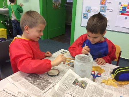 Der Umgang mit Pinsel, Schere und Kleber erfordert viel Geduld, aber macht richtig Spaß. Mit unseren Windlichtern, Engeln und Sternen wollen wir einen schönen Stand dekorieren. Zwischendurch proben wir unser Lied "Zwei Weihnachtsmäuse" mit dem wir den Markt am Donnerstag eröffnen. Diese Projekttage sind eine tolle Abwechslung zum Rechnen, Schreiben und Lesen lernen.