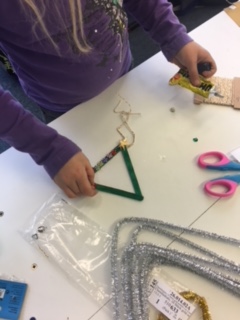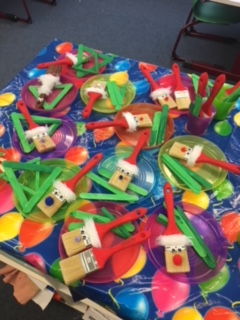 Die Kinder bemalten und gestalteten Pinsel, sodass daraus lustige Weihnachtsmänner wurden. Vielen Dank nochmals an Herrn Hermle für die großzügige Spende. Außerdem haben wir Karten gestaltet sowie Sterne und Tannenbäumchen aus Holzspateln bemalt und verziert.