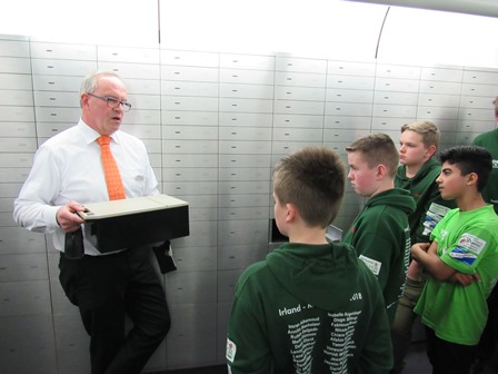 Am Ende des Workshops wurde die Klasse durch die Volksbank geführt. Am Geldautomaten lernten die Schüler, wie mit einem Handy dank der „VR Banking App“ direkt am Automaten Geld abgehoben werden kann oder kleine Beträge sehr schnell überwiesen werden können.Das Highlight der Führung war die Besichtigung der Silberkammer, die durch eine dicke Tresorwand gesichert ist. Nicht einmal die Mitarbeiter der Volksbank wissen, welche Schätze hier lagern.