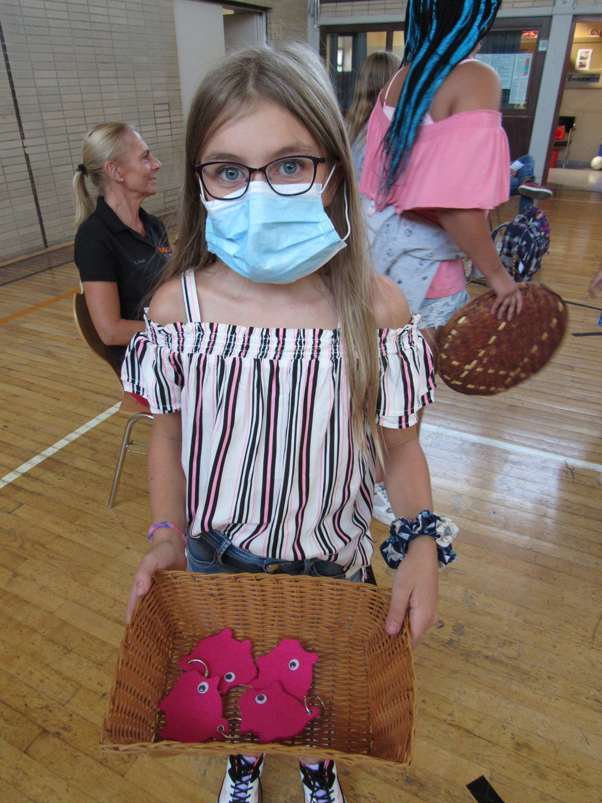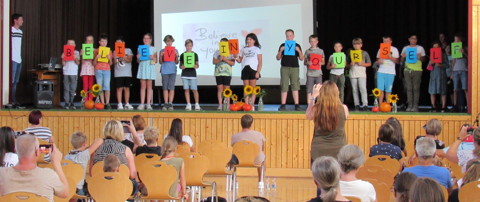 Diese ließen es sich auch nicht nehmen, sich kurz persönlich vorzustellen. Die künftige Englischlehrerin, Lynda Cullen, tat dies auch musikalisch mit ihrer Untermalung des Programms. Abschließend deklinierten die neuen Fünftklässler nach dem Schulmotto „Believe in yourself“ ihre Wünsche an das kommende Schuljahr, bevor sie symbolisch von ihren Vorgängern beschenkt wurden. Die ehemaligen Fünftklässler wünschten mit kleinen selbstgebastelten Glücksschwein-Anhängern „sauviel“ gute Erfahrungen, Erfolge und Emotionen.