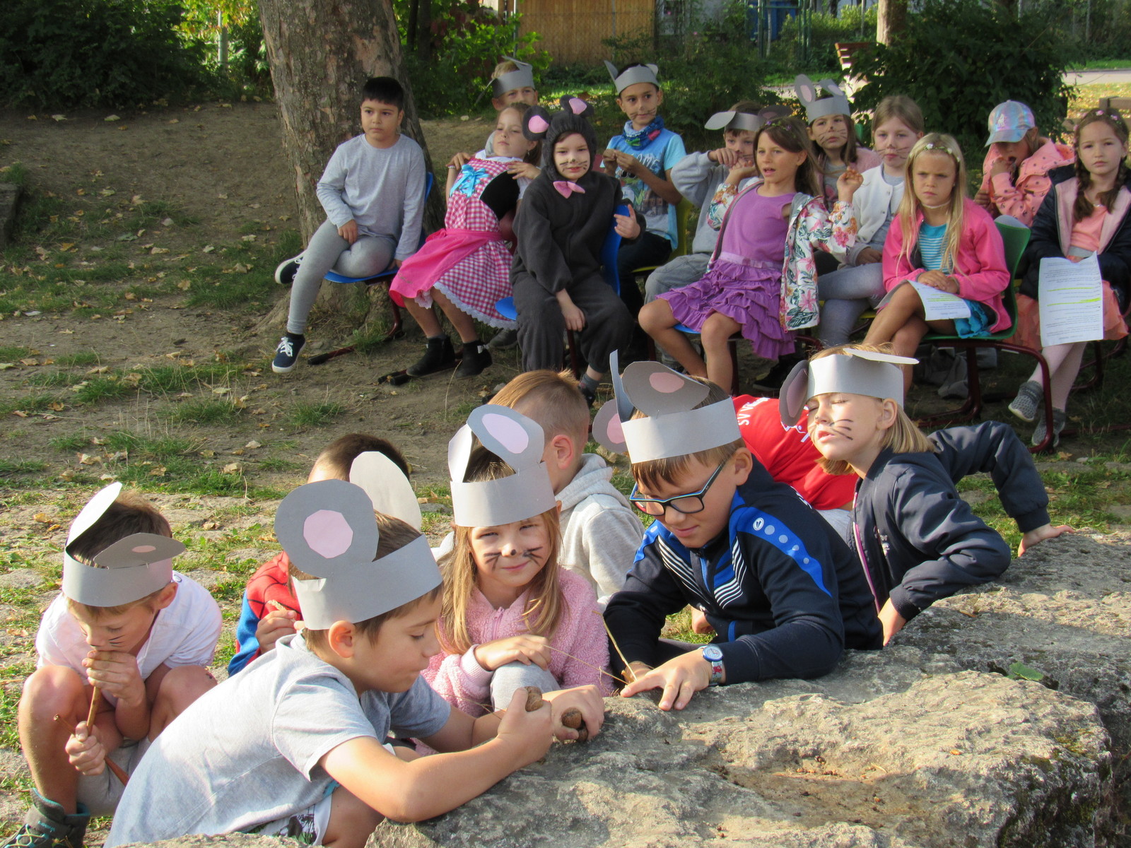 An ihrem allerersten Schultag begrüßten die Zweitklässler mit ihrem Klassenlehrer Raphael Meißner ihre Nachfolger mit einem farbenfrohen Stück. „Frederick und seine Mäusefamilie“ begeisterte die Kinder der ersten Klassen und verhalf zu einem schönen ersten Schultag.