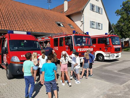 Nachdem sich die Klassenstufe 3 im Sachunterricht während der Schulschließung mit dem Thema Feuer beschäftigt hatte, stand am 21.07.2021 ein Besuch bei der Feuerwehr in Villingendorf auf dem Programm. Der Kommandant, Robert Flaig und Wolfgang Flinsbach begrüßten uns im Feuerwehrhaus und berichteten von den Aufgaben der Feuerwehr.