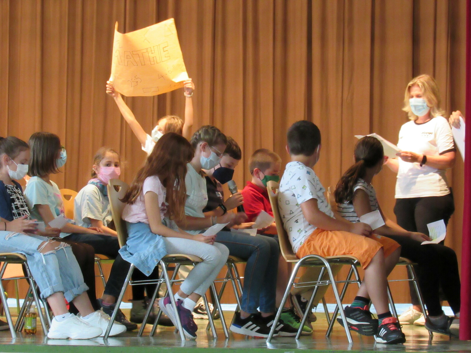 Das Bild der Zugreise bemühten auch die frischgebackenen „5er“, die für die zahlreich erschienen Eltern, Geschwister uns Großeltern die bevorstehende Zugreise mit grünem Klassenzimmer, Apfel- und Irlandklasse, der Berufsorientierung und viel „tut-tut“ skizzierten. Zusammen mit den Klassenlehrkräften Annette Hube und Simon Schoch hatte die Gruppe gleich an ihrem ersten Schultag diese Präsentation erarbeitet.