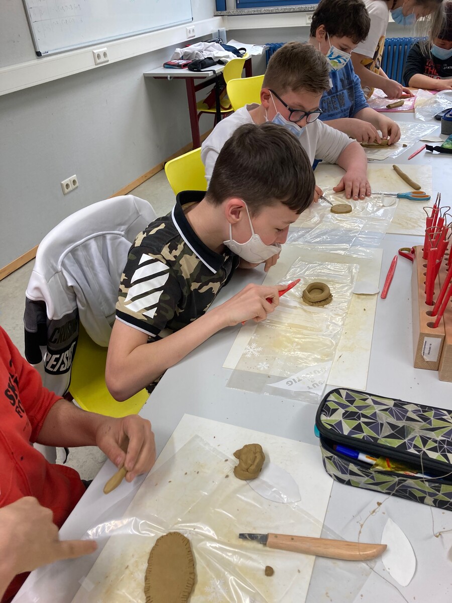 Die Kinder der Klasse 5a beschäftigten sich im Fach Geschichte mit der Steinzeit und der Antike. In diesem Zusammenhang setzten sie sich auch mit dem Kulturgut des Töpferns auseinander. Mit dem handlungsorientierten Konzept der Schule und dank der ehemaligen Lehrerin Sabine Gauß gab es einen kleinen Töpfer-Workshop. Die Fünftklässlerin Louisa Heim berichtet: