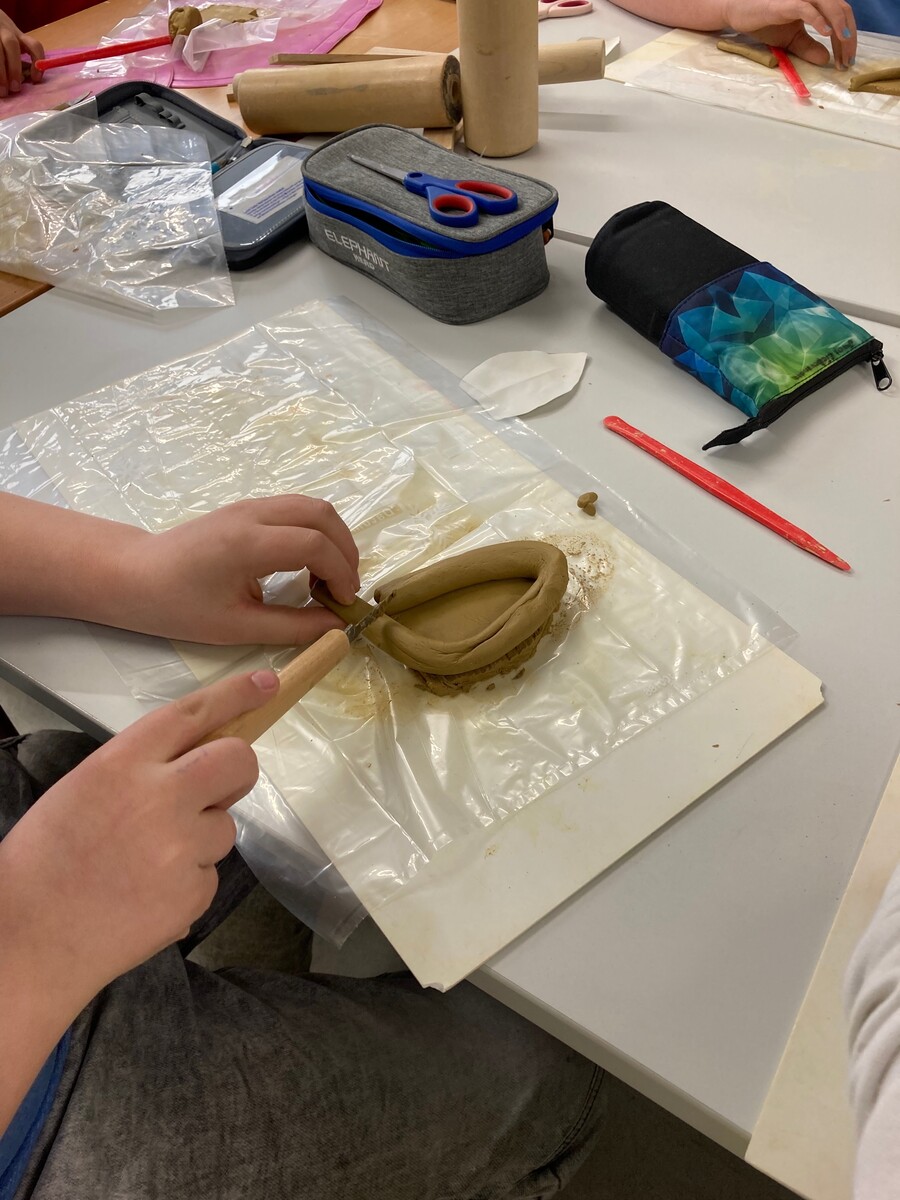 „Erst hat und Frau Gauß alles erklärt und wir haben alle aufmerksam zugehört. Dann haben wir alle ein Stück Ton bekommen und mussten dieses erst einmal schlagen, sodass die Luft rausgeht. Außerdem haben wir die Daumentechnik eingeübt. Als Frau Gauß sagte: „Wir machen eine Öllampe!“ haben wir nicht gewusst, was das ist und sie hat uns einige Modelle gezeigt. Nachdem alle Kinder noch einmal ein großes Stück Ton bekommen und geschlagen hatten, haben alle eine Form mit dem Tonmesser ausgeschnitten. Das untere Teil wurde aufgeraut und eine dicke lange Schnur geformt. Diese wurde auf den Boden gelegt und an der Seite leicht verschmiert, damit es schön haftet. Danach mussten alle nochmal eine dicke lange Schnur formen und diese auf die andere Seite legen und wieder leicht verschmieren. Dann mussten wir die zweite Schicht wieder aufrauen und den Deckel darauf legen. Davor mussten wir aber noch ein Loch rein machen. Zum Schluss ahben wir den Henkel hergestellt und angefügt.“