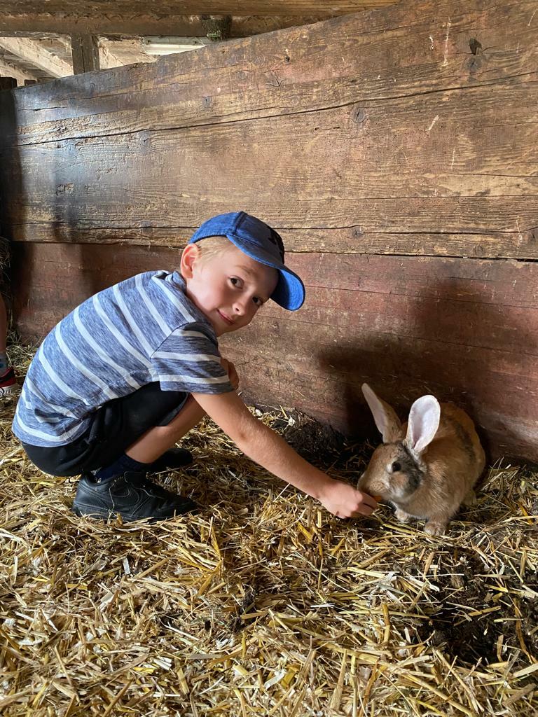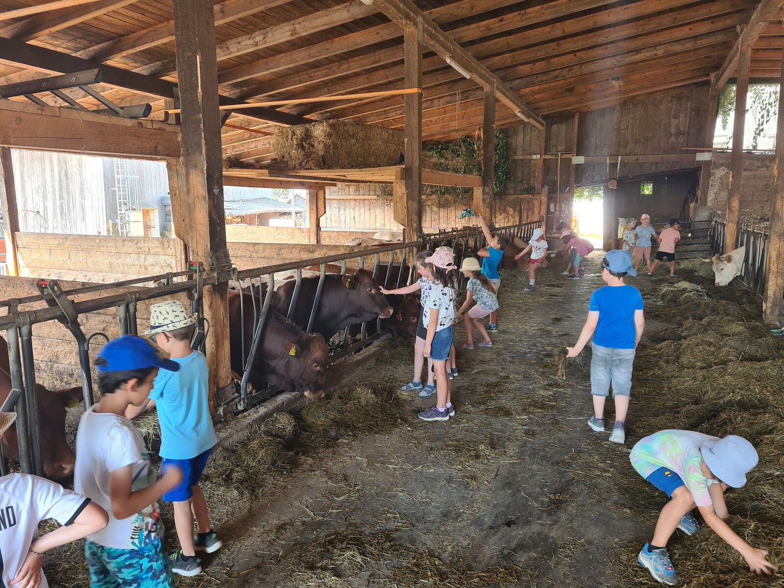 Auf dem Hof angekommen warteten schon die Hühner und Enten auf uns. Manche der Hühner ließen sich sogar geduldig streicheln, während andere lieber in einer stillen Ecke ihren Nachwuchs ausbrüteten. Im großen Kaninchenauslauf wurden so einige Freundschaften zwischen den Tieren und Kindern geschlossen. Weiter ging es dann in den großen und offenen Kuhstall. Ausgerüstet mit duftendem Heu durften wir die Kühe füttern und diese faszinierenden Tiere aus nächster Distanz beobachten. Nachdem die Rinder ihre Mahlzeit erhalten hatten, waren wir an der Reihe. In einem liebevoll hergerichteten Strohballen-Café wurden wir von Familie Scheuermann mit erfrischender Melone, köstlichen Muffins und kühlen Getränken versorgt. An der Schule angekommen waren wir zwar müde aber auch überaus glücklich und um eine wertvolle und einmalige Erfahrung reicher.