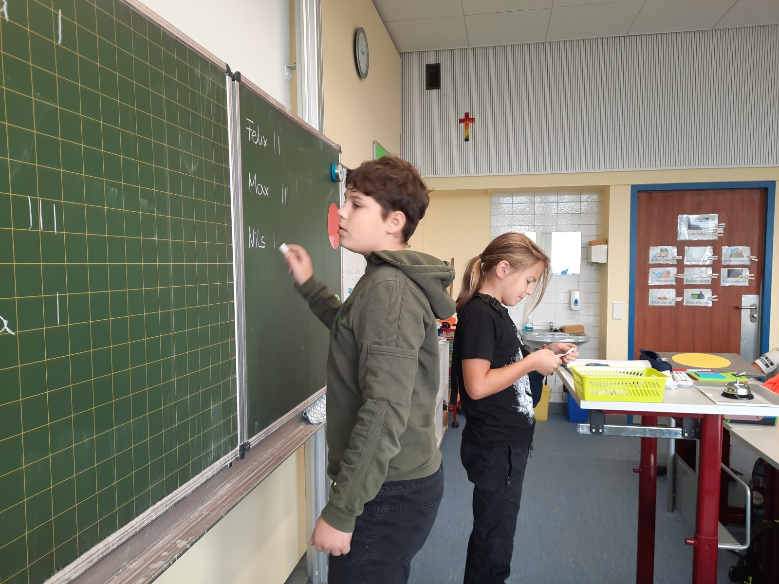 Die Wahlhelfer Jaron und Sascha führten die Wahl durch und schnell standen ein Klassensprecher und eine Klassensprecherin fest: