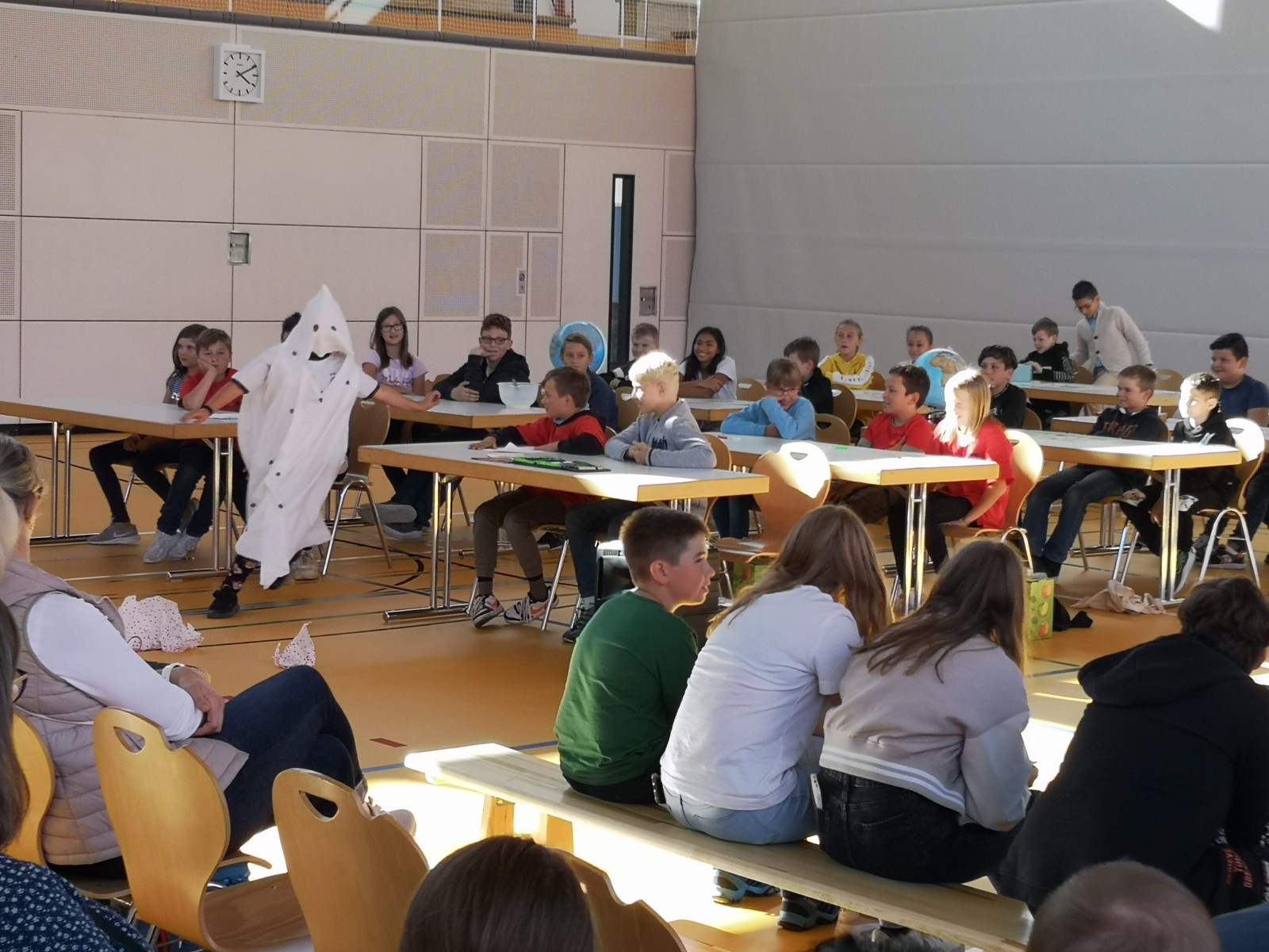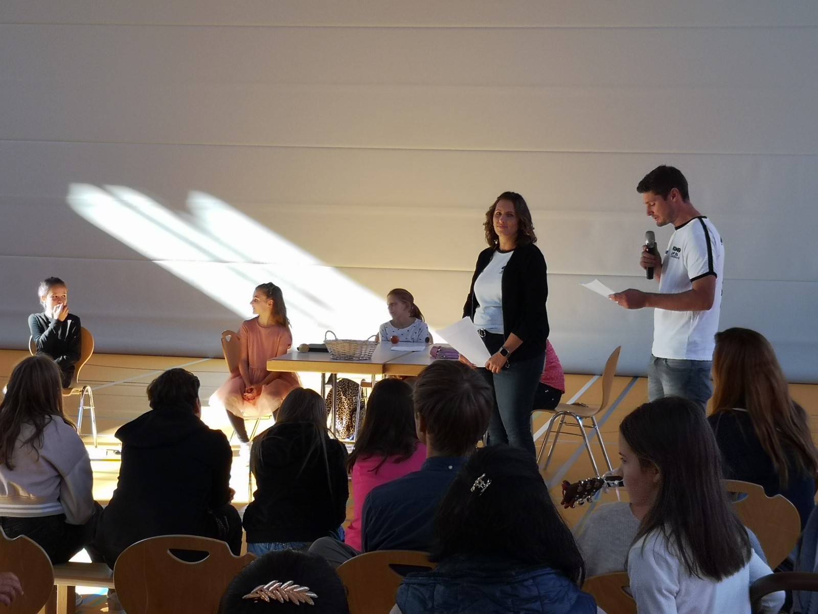 Ines Hetzel und Gordian Hoferer berichteten den anwesenden Familien von den spannenden Kennenlerntagen und dem tollen Einstudieren des Theaterstücks. Im Theaterstück „Der Ernst des Lebens“ wurde aufgezeigt, wie viel neue Herausforderungen die weiterführende Schule für die Schülerinnen und Schüler mit sich bringt. Dazu zählen die neuen Fächer, die mit Hilfe verschiedener Gegenstände und den schauspielerischen Künsten der Fünftklässler dargestellt wurden. Getreu dem Schulmotto „Believe in yourself“ wurden die Herausforderungen im Theaterstück gemeistert. Ines Hetzel und Gordian Hoferer richteten passend dazu die Worte an die Schülerinnen und Schüler, sie sollen an sich selbst glauben und keine Angst vor Neuem haben.