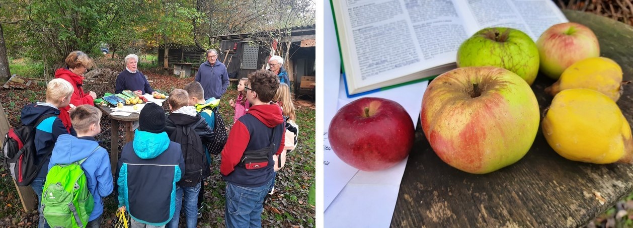 Nachdem sie sich und den Ursprung sowie die Aufgaben der Umweltschutzgruppe vorgestellt hatten, durften die Schülerinnen und Schüler verschiedene Apfelsorten der Streuobstwiese kosten. Voller Verwunderung stellten die Kinder dabei begeistert fest, dass Äpfel ganz unterschiedlich aussehen, riechen und schmecken können.