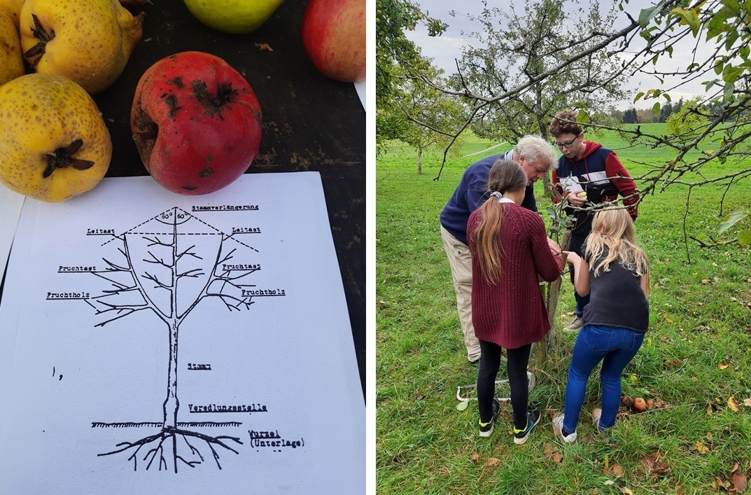 Die Wiesen- und Baumpflege nahm einen weiteren Schwerpunkt ein. Die Kinder entfernten mit einem Rechen das Laub vom Boden, welches einer Würmerzucht weitergegeben wird, sodass wieder nährstoffreiche Komposterde entsteht. Solch eine Erde verteilten die Schülerinnen und Schüler um die Obstbäume, damit sie besser im Winter geschützt sind. Jo Burry zeigte den Fünfern, wie man Bäume zurückschneidet, damit sie bald wieder viele Früchte tragen. Mithilfe einer Abbildung und einer bestimmten Anordnung von Haupt-, Leit- und Fruchtästen erkannten die Kinder eindrücklich, welche Äste sie selbst mit Astscheren entfernen sollten.