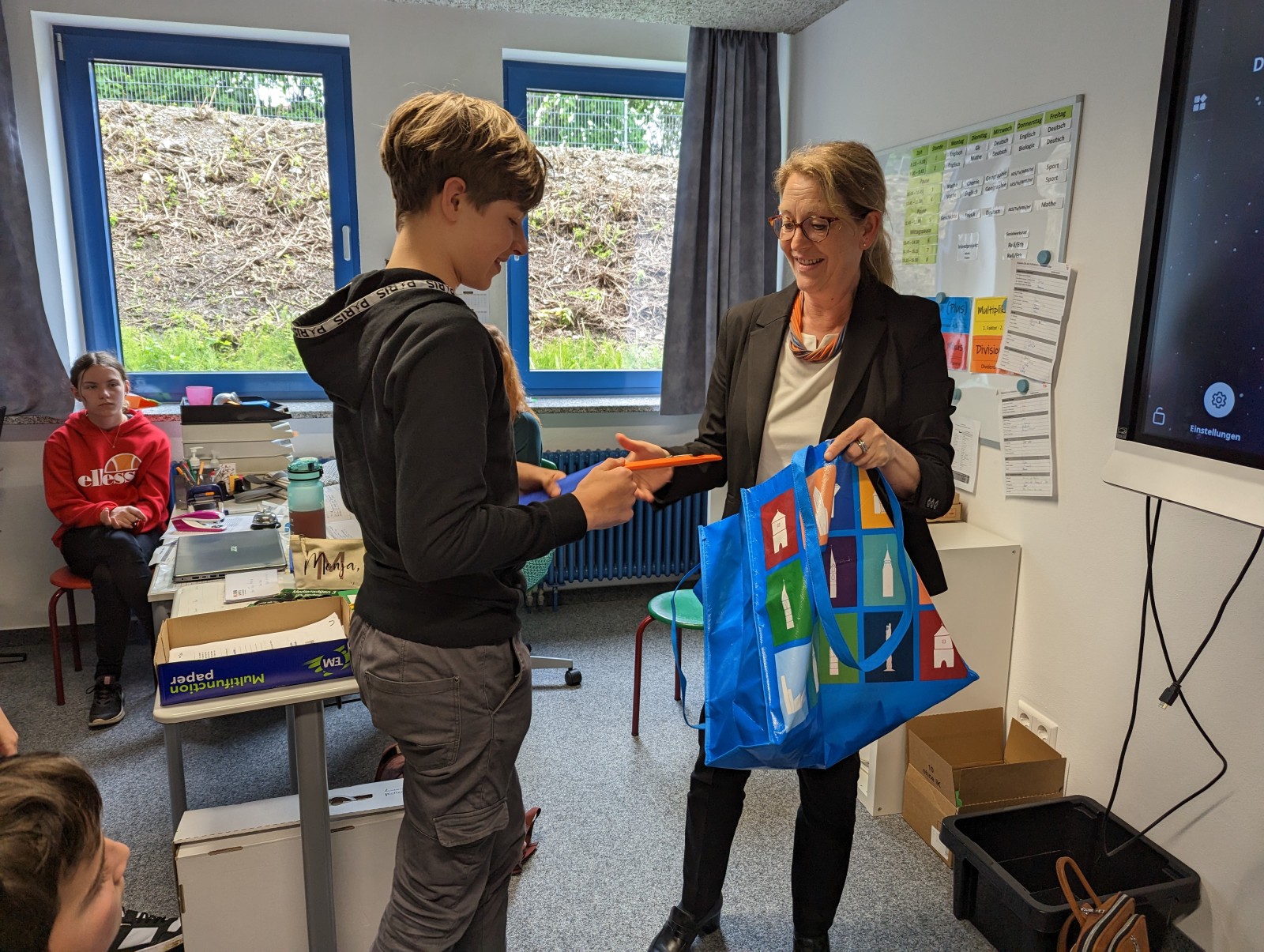 Stolz überreichte der Vorstand der Irlandklasse bei einem erneuten Besuch von Frau Mathieu das Spiel. Auch Frau Mathieu zeigte sich sehr erfreut über das Ergebnis. Als Dankeschön überreichte sie den helfenden Schülern ein kleines Präsent und versprach zudem eine Spende für die anstehende Klassenfahrt nach Irland, über die sich die Siebtklässler sehr gefreut haben.