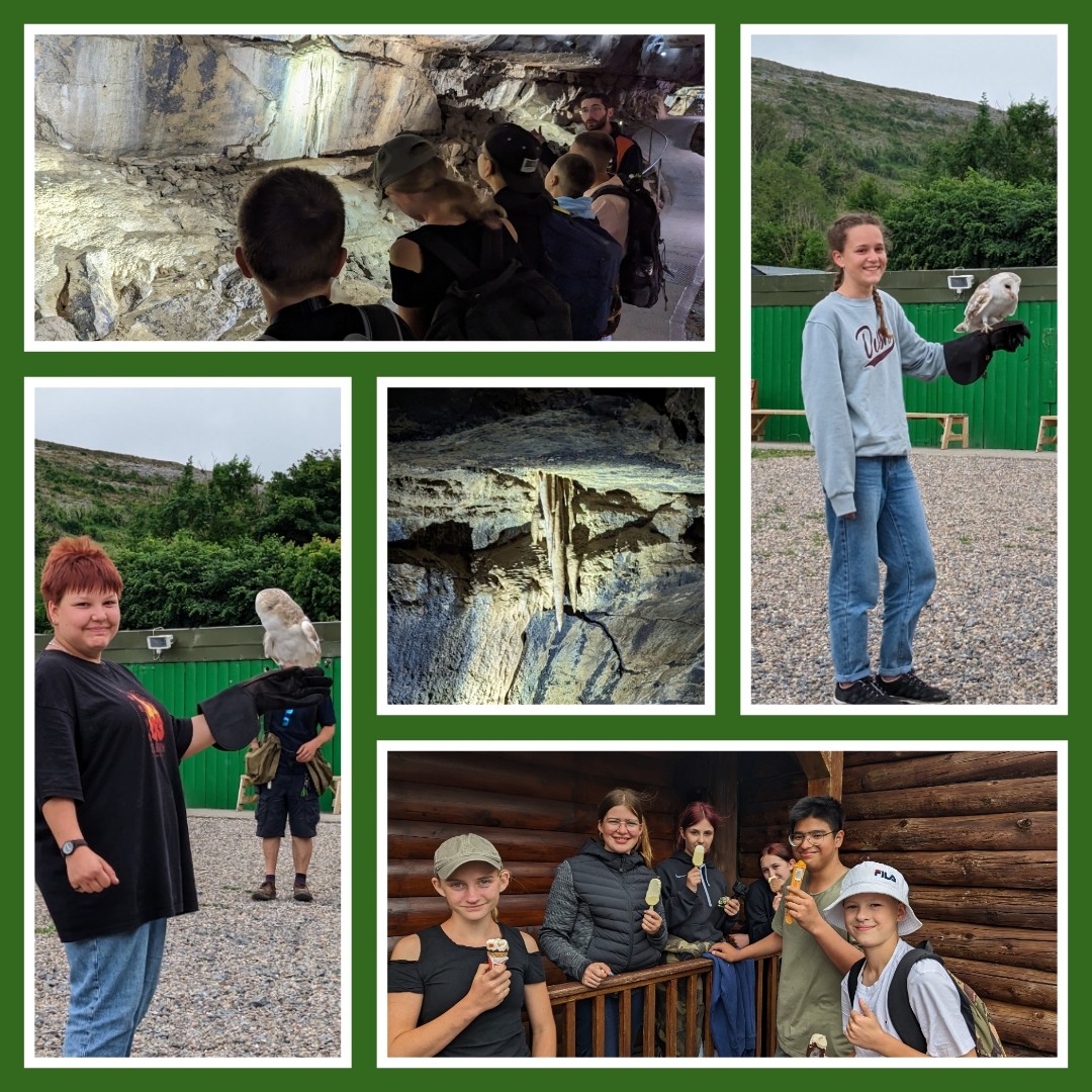 Die Irlandklasse ist heute zur Aillwee Cave gewandert. Wir liefen dabei durch einen Haselnusswald und mussten den Weg als Gruppe mit Hilfe einer Karte finden. Davor haben wir noch ein Gruppenbild vor einem Schild gemacht - an der gleichen Stelle, wie es jede Irlandklasse jedes Jahr immer macht. Bei der Aillwee Cave haben wir eine Führung durch die Höhle gemacht und danach eine Greifvogelshow angeschaut. Abends haben wir noch gekocht und Spiele gespielt.