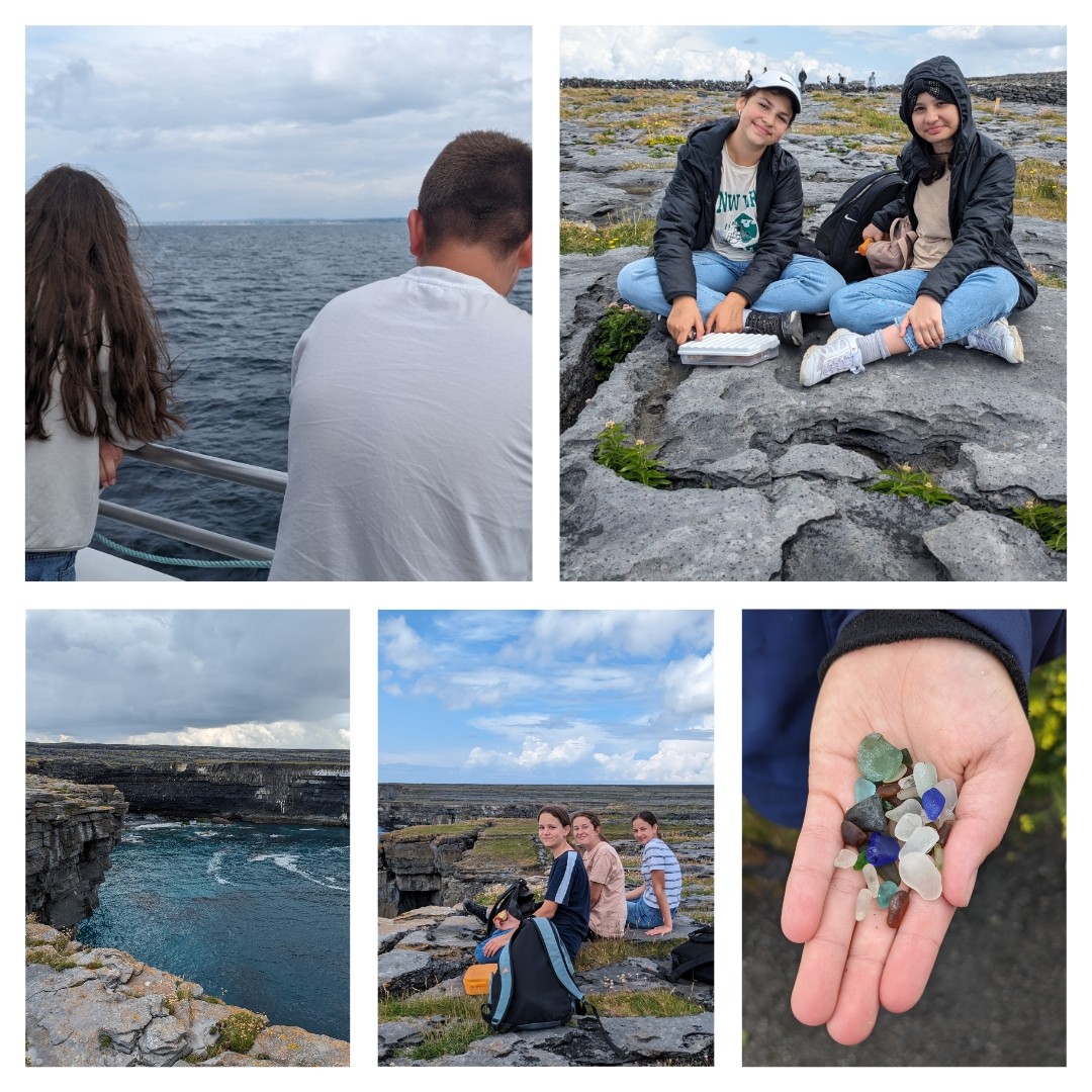Heute sind wir mit einer Fähre auf die Aran Islands gefahren. Vom Hafen aus wanderten wir eine Weile und genossen den Ausblick zu den Klippen. Auf dem Rückweg gingen wir zum Strand und sammelten Nixentränen. Manche haben sogar die seltenen türkisfarbenen Nixentränen gefunden. Zum Schluss fuhren wir wieder mit der Fähre zurück und das Kücheteam kochte noch ein leckeres Abendessen im Hostel während der Berichtsdienst alle Erlebnisse vom heutigen Tag festhielt.