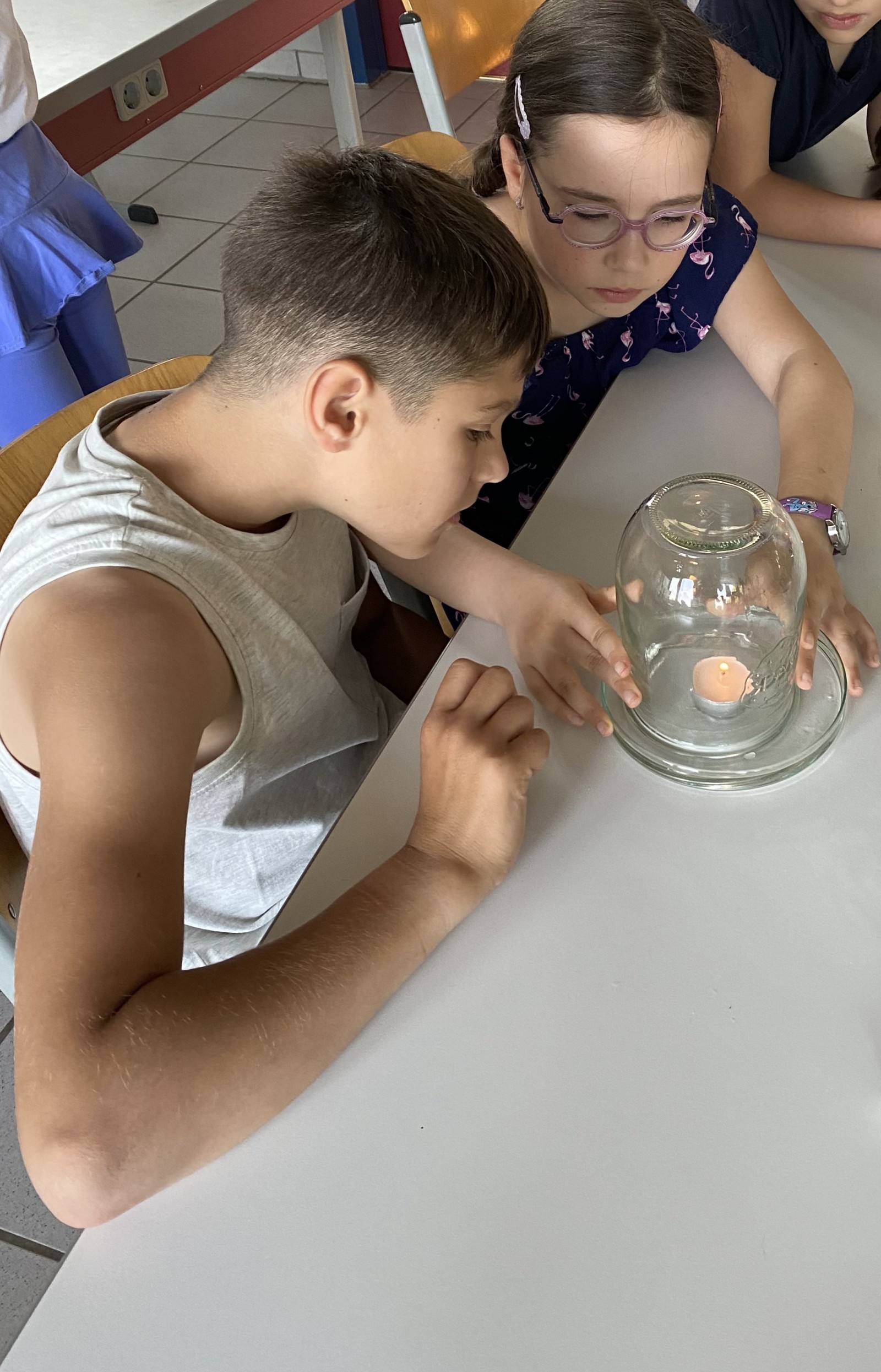 Wir haben eine Kerze angezündet und ein Glas darübergestülpt. Die Kerze ist nach ungefähr 17 Sekunden erlischt. Im nächsten Versuch haben wir einen kleinen Teller mit Wasser gefüllt und ein Teelicht angezündet. Danach haben wir ein Glas darüber gestellt. Zuerst ging die Kerze aus, weil sie nicht mehr atmen konnte. Dann ist das Wasser im Glas gestiegen und die Kerze schwamm nach oben. Die Sachunterrichtsstunde war sehr toll und wir hatten viel Spaß.