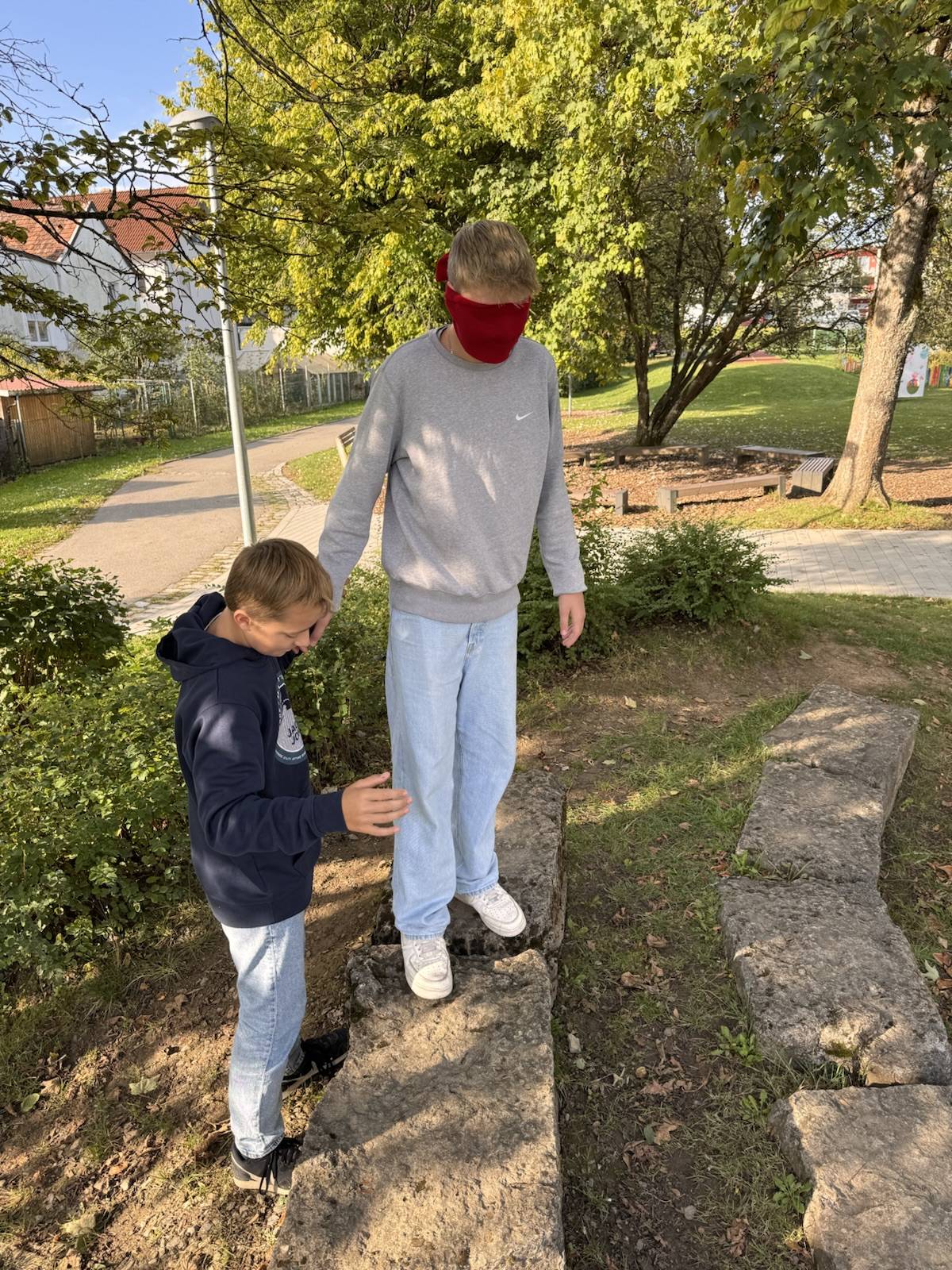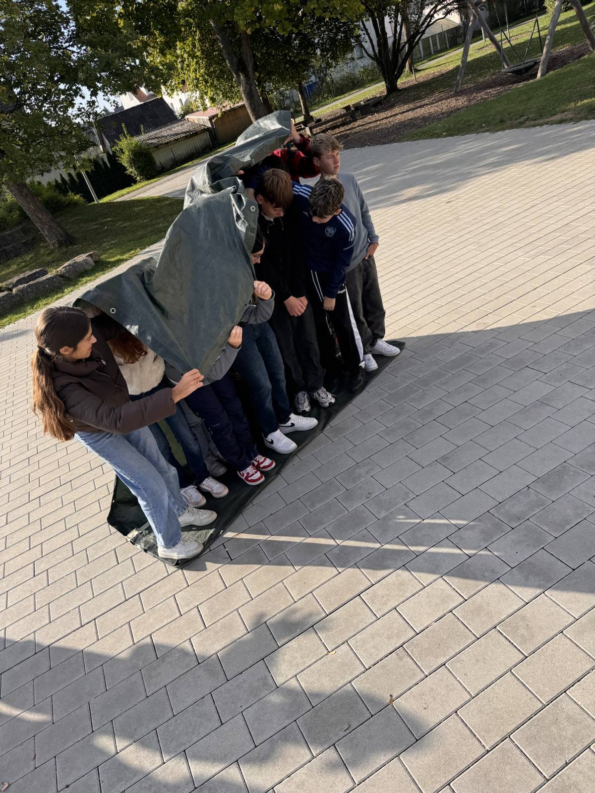Am 19.09.2024 haben die Klassen 8a und 8b zusammen mit ihren Klassenlehrerinnen und Frau Seifried eine Einheit zum Teambuilding durchgeführt. Neben Vertrauensübungen, wie dem gegenseitigen Führen über das Schulgelände mit verbundenen Augen, bewältigten sie in Kleingruppen verschiedene kooperative Challenges. In ihren Teams haben sie gemeinsam eine Decke gewendet und in 3er- bzw. 4er-Gruppen mussten sie einen Becher so weit wie möglich hinter einer markierten Linie abstellen, ohne dabei den Boden zu berühren. Im Fokus stand, dass die Jahrgangsstufe weiter zusammenwächst, sich gegenseitig unterstützt und zusammenarbeitet.