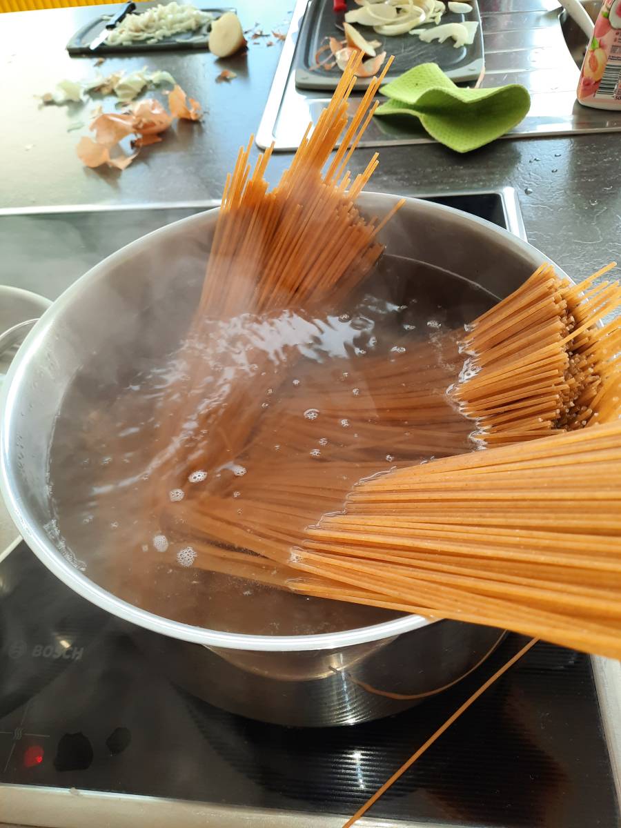 Dies nahmen die Schülerinnen und Schüler zusammen mit ihrer Lehrerin Annette Hube zum Anlass, gemeinsam zu kochen und zu essen. Vorab wurde gemeinschaftlich das Menü zusammengestellt: Salat, Spaghetti mit Tomatensoße und als Nachtisch Eis.