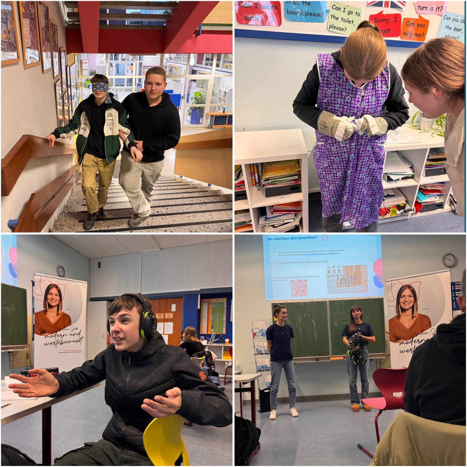 Einen tollen Einblick in ihre Arbeit ermöglichte auch die Stiftung St. Franziskus, die sich den Achtklässlerinnen und Achtklässlern am Nachmittag des 10. Dezember vorstellte. Nachdem Frau Richter und ihre Kollegin die Stiftung und ihre Geschichte als solche vorgestellt hatten, erläuterten sie, in welchen Bereichen (Altenpflege, Heilerziehungspflege, Hauswirtschaft, kaufmännischer Bereich, …) die Stiftung tätig ist und ausbildet. Offen gingen sie hierbei auf die vielen Vorteile und Besonderheiten der Arbeit so eng am Menschen ein und konnten so das Interesse vieler Schülerinnen und Schüler gewinnen. Besonders interessant und sicher auch abgesehen von der Berufsorientierung eine wichtige Erfahrung war der praktische Teil des Nachmittages: abwechselnd durften alle Schülerinnen und Schüler durch Augenbinden und Blindenstock sowie Kopfhörer die Erfahrung machen, wie es ist, nichts mehr zu sehen oder zu hören und auf Hilfe angewiesen zu sein und andersherum auch, wie es sich anfühlt, jemanden zu unterstützen, der aufgrund seiner Einschränkungen Hilfe braucht.