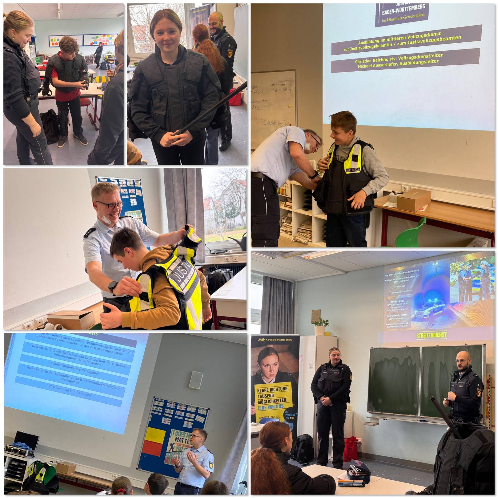 Am 13. Dezember waren sowohl eine junge Streifenpolizistin vom Revier Rottweil und ihr Kollege Dennis Klaiber, der beim Polizeipräsidium Konstanz im Bereich der Einstellungsberatung tätig ist, als auch Christian Reichle, stv. Vollzugsdienstleiter der Justizvollzugsanstalt Rottweil und sein Kollege Michael Ausserhofer, Ausbildungsleiter der JVA Rottweil zu Besuch in den Klassenzimmern der achten Klassen, um sich und ihre Arbeit im Polizeidienst bzw. im Justizvollzug vorzustellen. Abgesehen von einem spannenden Einblick in die Welt der Polizei und der JVA im Allgemeinen und einer großen Offenheit gegenüber der vielen Fragen der Jugendlichen, erläuterten sie, was ihren Berufsalltag ausmacht, welche Vorteile sich durch die Arbeit bei der Polizei bzw. im Vollzug ergeben, welche Zugangsbedingungen gelten und welche Möglichkeiten der Aus- und Weiterbildung sich bieten.