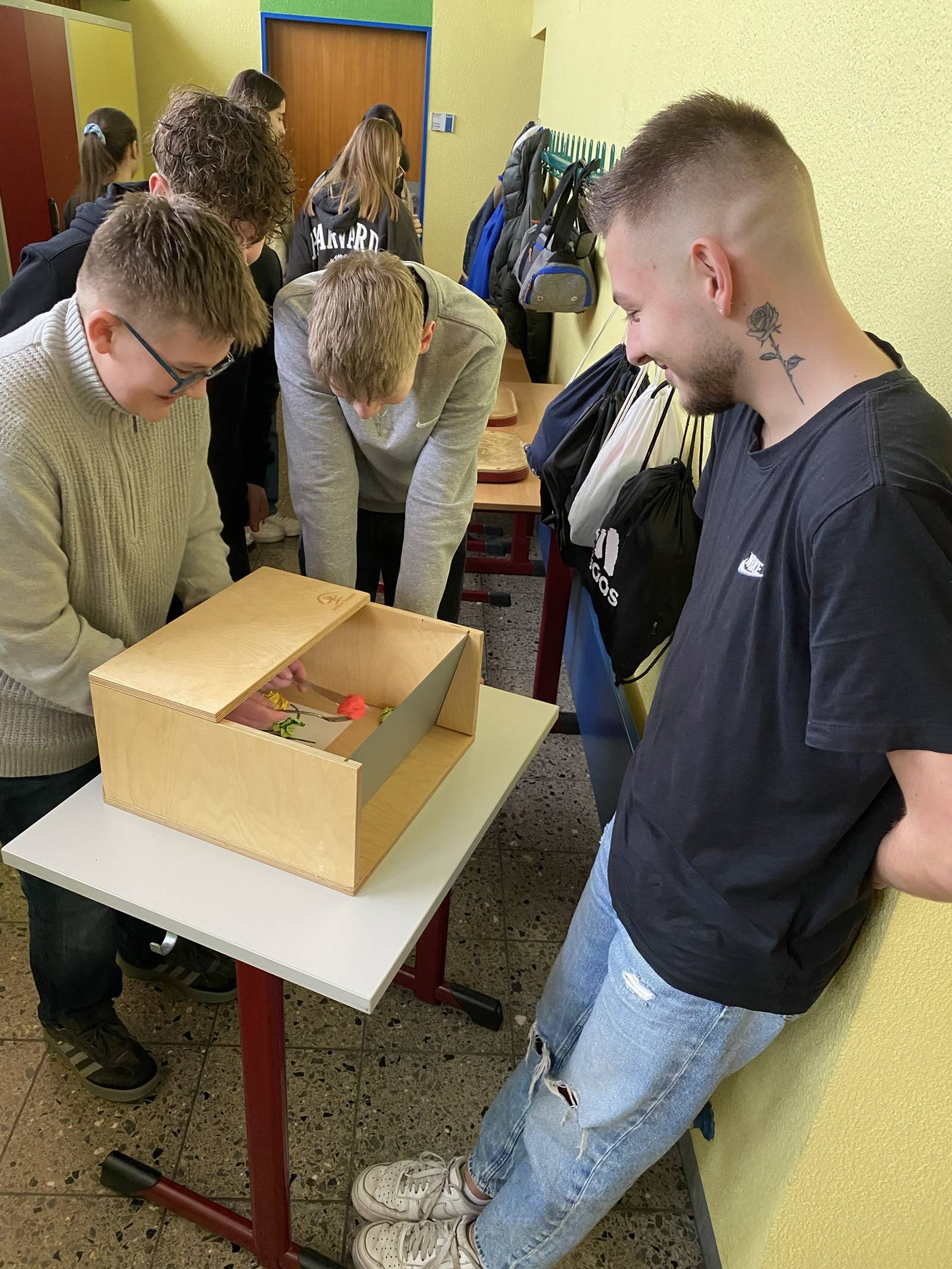 Interessant für die Jugendlichen waren besonders auch die kurze Präsentation und die entsprechenden Schilderungen über typische und häufig auftretende Alterserkrankungen, mit denen Menschen, die in diesen Bereichen arbeiten, täglich konfrontiert sind: Erkrankungen des Bewegungsapparates und der Sinnesorgane und die Demenz. Um Demenz etwas erfahrbarer zu machen, hatten die Ausbildungsbotschafter ein Modell aus Holz dabei, bei dem die Schülerinnen und Schüler unter erschwerten Bedingungen (eingeschränktes Blickfeld, Spiegelung, …) mit Messer und Gabel „essen“ sollten – eine eindrucksvolle Erfahrung.