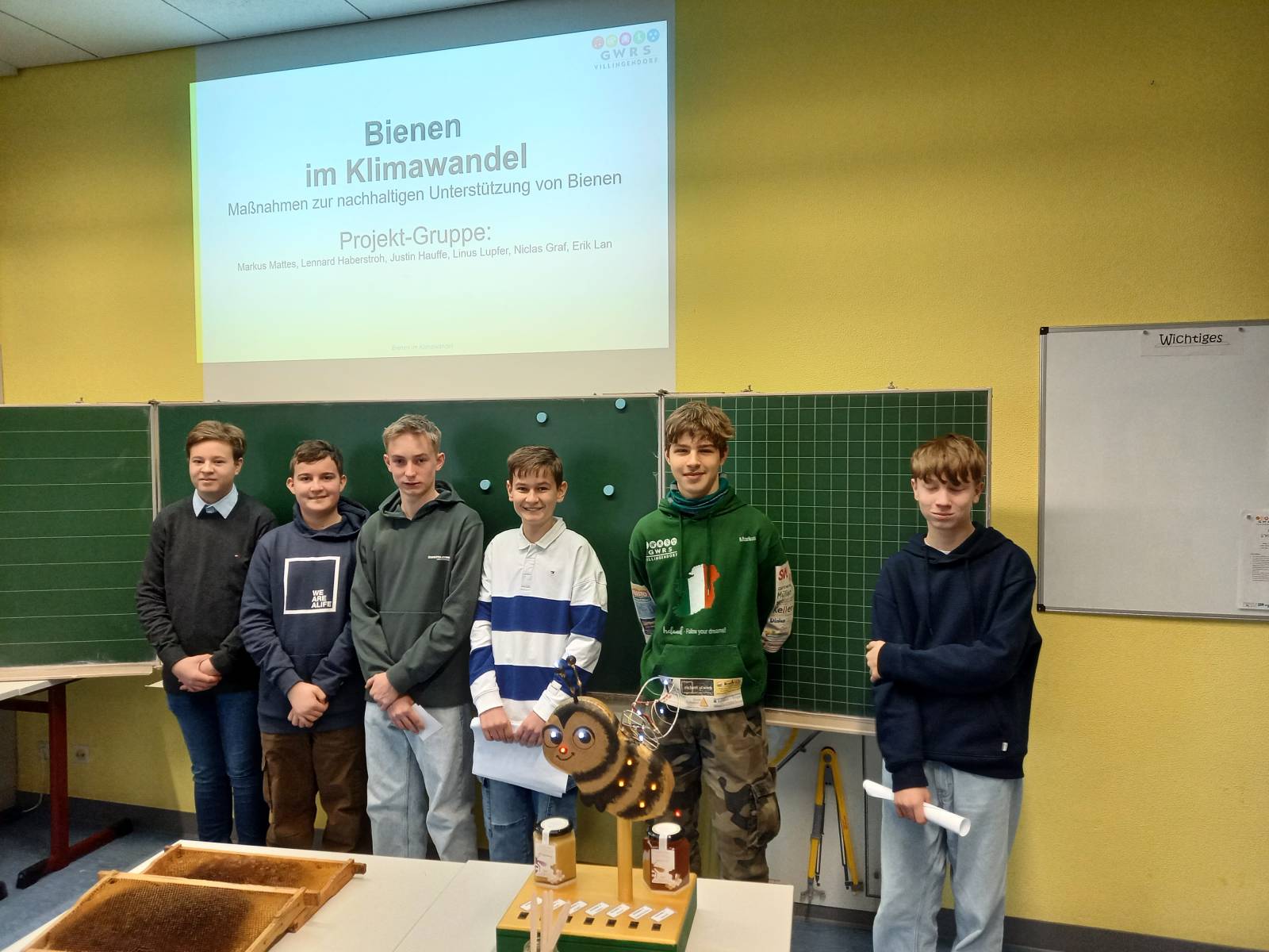 Wer in die Welt der Bienen eintaucht, begibt sich auf eine weitläufige sowie atemberaubende Entdeckungsreise. Dieser Herausforderung stellten sich Linus, Lennard, Markus, Niclas, Justin und Erik. Arbeitsteilig erschlossen sie sich verschiedene Themenaspekte, besuchten mehrmals zwei Imker, beschäftigten sich mit der Bienenfreundlichkeit des Schulgartens und stellten dar, wie Bienen als lebensnotwendige Bestäuber eine zentrale Rolle in vielen landbasierten Ökosystemen einnehmen. Dabei setzen die Auswirkungen des Klimawandels, Parasiten, fehlende Blumenwiesen und der landwirtschaftliche Einsatz von Giften den Insekten zu. Mithilfe eines selbst gebauten Bienen-Modells erläuterte Niclas den funktionalen Körperbau einer Biene, wodurch auch noch einmal der Prozess des Bestäubens eindrucksvoll veranschaulicht werden konnte.