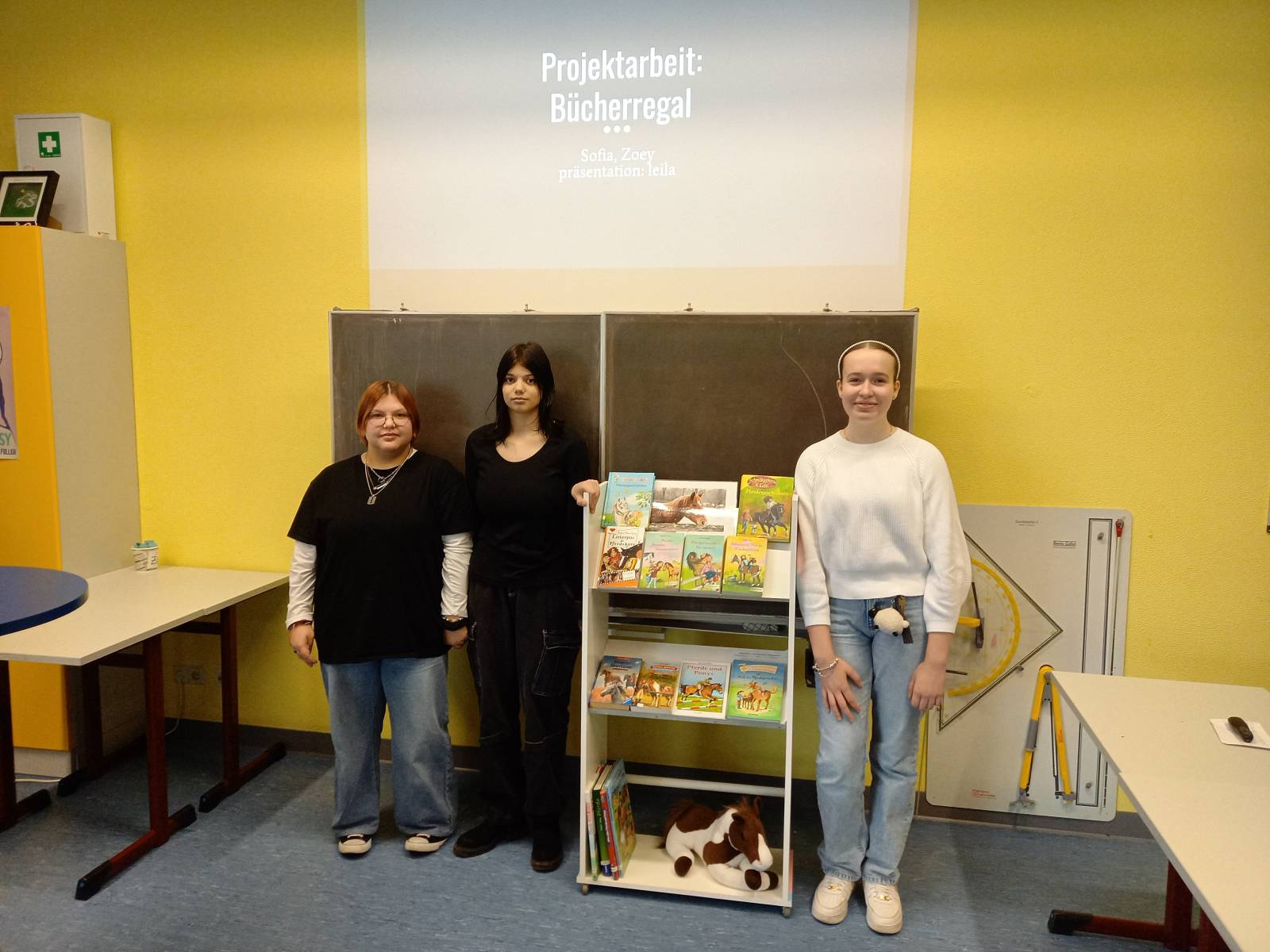 Kinder lesen zu wenig? Ja, da sind sich verschiedene seriös-wissenschaftliche Studien einig. Gegen solche gesamtgesellschaftlichen Entwicklungen können wir nichts tun? Mitnichten – wie Sofia, Leila und Zoey mit ihren Aktivitäten zweifelsfrei bewiesen haben. So sind zwei dieser Schülerinnen in der Sozialwerkstatt „Schülerbücherei“ engagiert und entwickelten die Idee, dass mit einem Motto-Regal das Leseinteresse der Grundschüler wieder steigen könnte. Das Konzept: Auf einem kindgerecht großen sowie auf Augenhöhe gestalteten Regal sollen verschiedene Buchmedien zu wechselnden Themenwochen präsentiert werden. Arbeitsteilig sorgten die Mädchen für eine rasche Umsetzung dieses ambitionierten Vorhabens. Leila plante das Bücherregal, besorgte Holzbretter und montierte das Möbelstück in der Werkstatt. Sofia und Zoey arbeiteten derweil die ersten Themenwochen aus und organisierten geeignete Bücher dazu. Der Start ist mit der ersten Themenwoche „Pferde“ bereits erfolgt. Und tatsächlich ist das Interesse der Kinder groß. Das Folgethema „König Fußball“ steht bereits in den Startlöchern.
