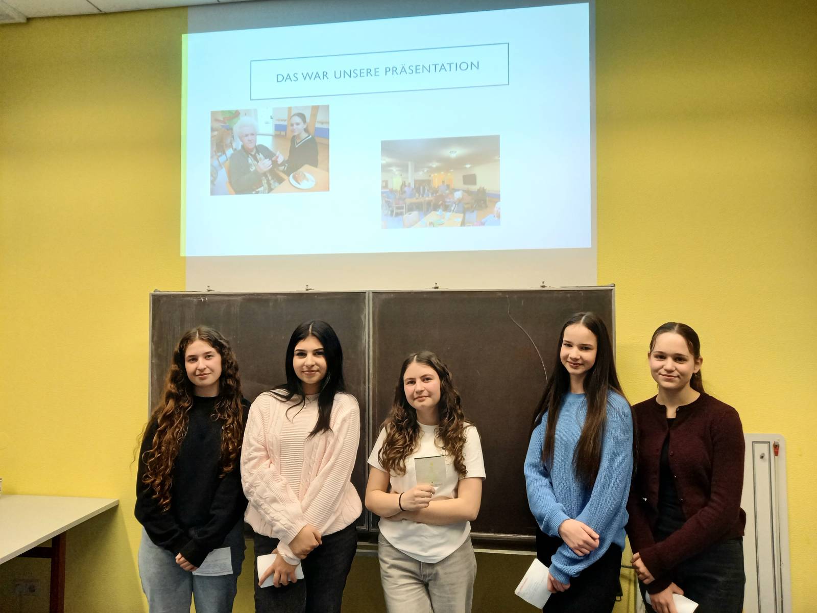 Mit Melanie, Ines, Sara, Maia und Delina hat sich eine weitere Projektgruppe gefunden, die Abwechslung in die tägliche Routine einer Senioreneinrichtung bringen wollen – an einem anderen Ort und unabhängig von den Aktivitäten des anderen Teams. In Absprache mit den Pflegekräften organisierten die fünf Mädchen einen kompletten Nachmittag, der im Zeichen der Vorweihnachtszeit stand. Sie eröffneten das gemütliche Miteinander mit der „Weihnachtsgeschichte“ aus dem Evangelium nach Lukas. Es folgten Lieder, Gedichte, ein intensiver Austausch mit den Senioren, Kaffee und Kuchen. Gemeinsam wurde gelacht, gesungen, erzählt und die adventliche Zeit wahrgenommen. Zudem hatten die Schülerinnen im Vorfeld schöne Weihnachtskarten gestaltet, die sie den Senioren schenkten und damit große Freude auslösten. Die Damen und Herren begannen, von ihrer Vergangenheit zu erzählen, was die Mädchen sehr berührt hat. Die Begegnungen seien eine sehr schöne Erfahrung gewesen, obwohl der Austausch mitunter recht emotional war.