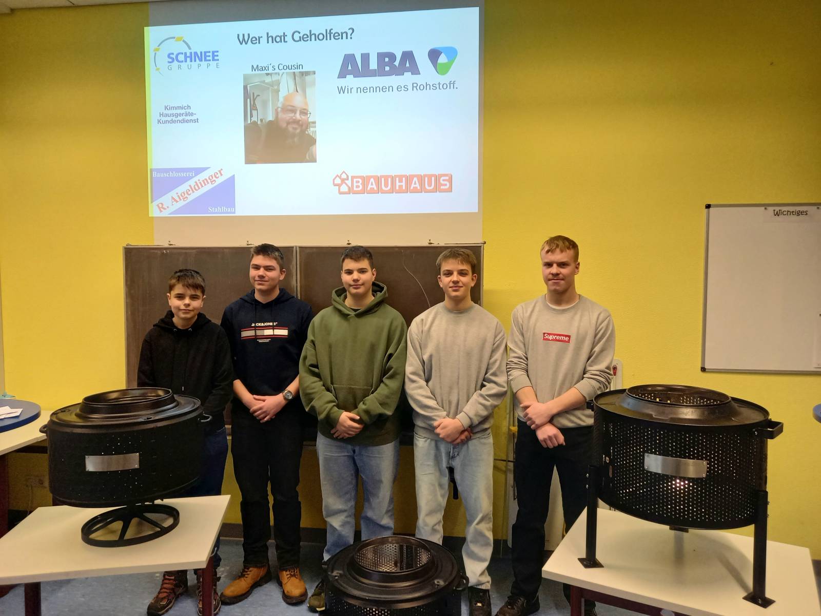 Als sich während des letzten Adventsmarktes einige Gäste an den bereitgestellten Feuerschalen wärmten, bemerkten einige „9er“, die gleich nebenan ihre Grillstation betrieben, dass die verwendeten Feuerkörbe bereits einige Jahre auf dem Buckel hatten. Aufgrund dieser Erkenntnis entwickelten Maxi, Maurice, Marlon, Bruno und Raphael ihre Projektarbeit. Sie besorgten sich Trommeln aus alten Waschmaschinen, behandelten diese mit hitzebeständigen Lacken, vollzogen Umbaumaßnahmen zu standfesten sowie anwendungssicheren Brennstoffbehältern, ergänzten solide Tragegriffe und sorgten durch das zielgerichtete Bohren von Lufteinlässen für eine geeignete Sauerstoffzufuhr. Im Anschluss an die gelungene Projektpräsentation übergaben die Jugendlichen gleich drei „neue“ Feuerschalen in die Obhut der dankbaren Schulgemeinschaft.