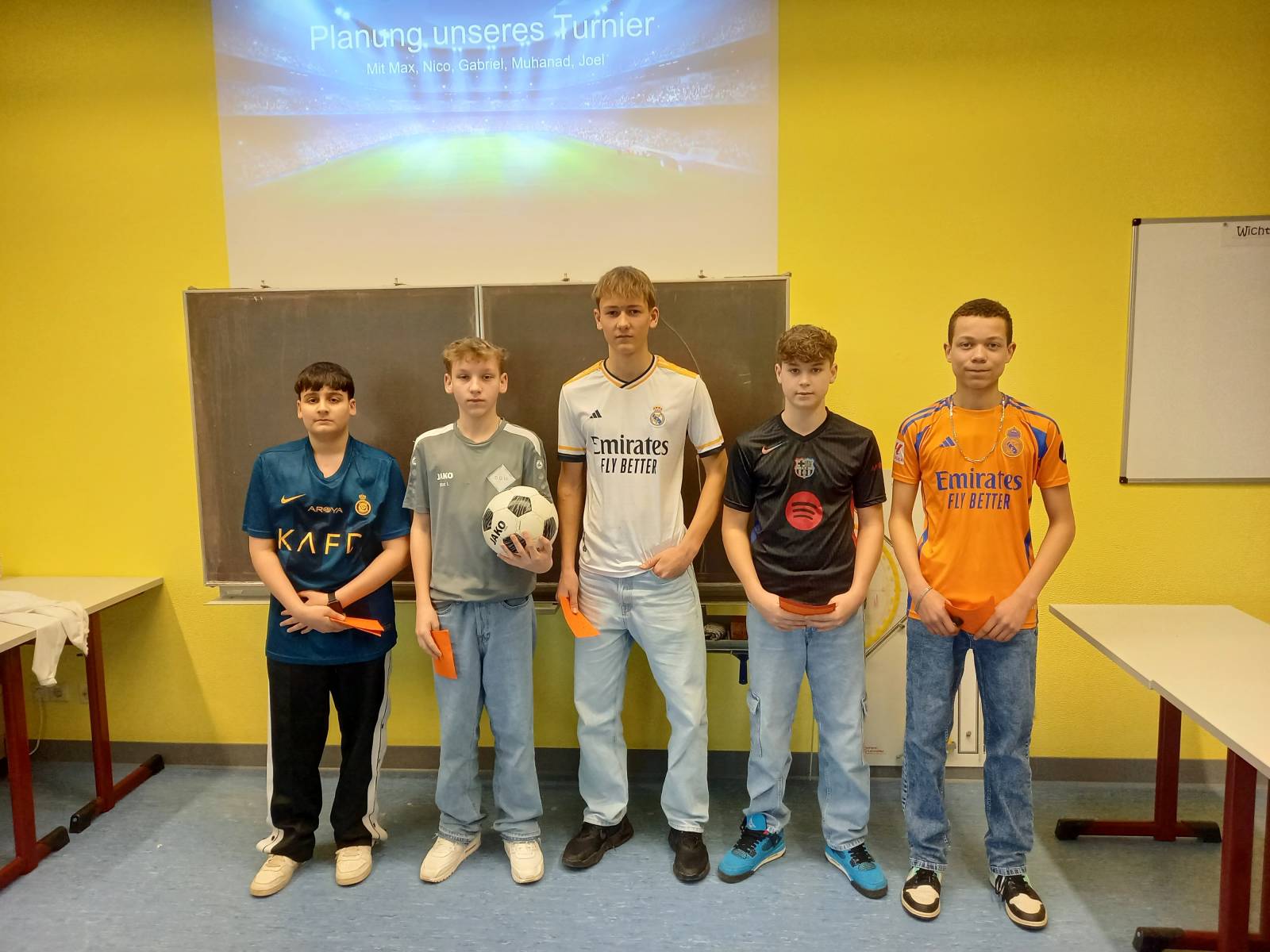 Die Organisation und Durchführung eines Fußballturniers stellt für alle Beteiligten eine große Herausforderung dar. Gabriel, Max, Joel, Nico und Muhanad haben sich dieser Aufgabe gestellt. Die Erarbeitung eines umsetzungsfähigen Spielplans, die Beachtung von unterschiedlichen Altersgruppen, die Wahl der Örtlichkeiten, die Organisation der technischen Voraussetzungen, die Kommunikation sowie Absprachen mit verschiedenen Ansprechpersonen und rechtzeitige Terminsetzungen bilden ein komplexes Arbeitsvolumen. Dem Zeitmanagement und der koordinierten Umsetzung des zuvor ertüftelten Projektplans kommen dabei zentrale Rollen zu. Die Gruppe befindet sich noch in der Planung und wird das Turnier in den kommenden Wochen ansetzen und durchführen.
