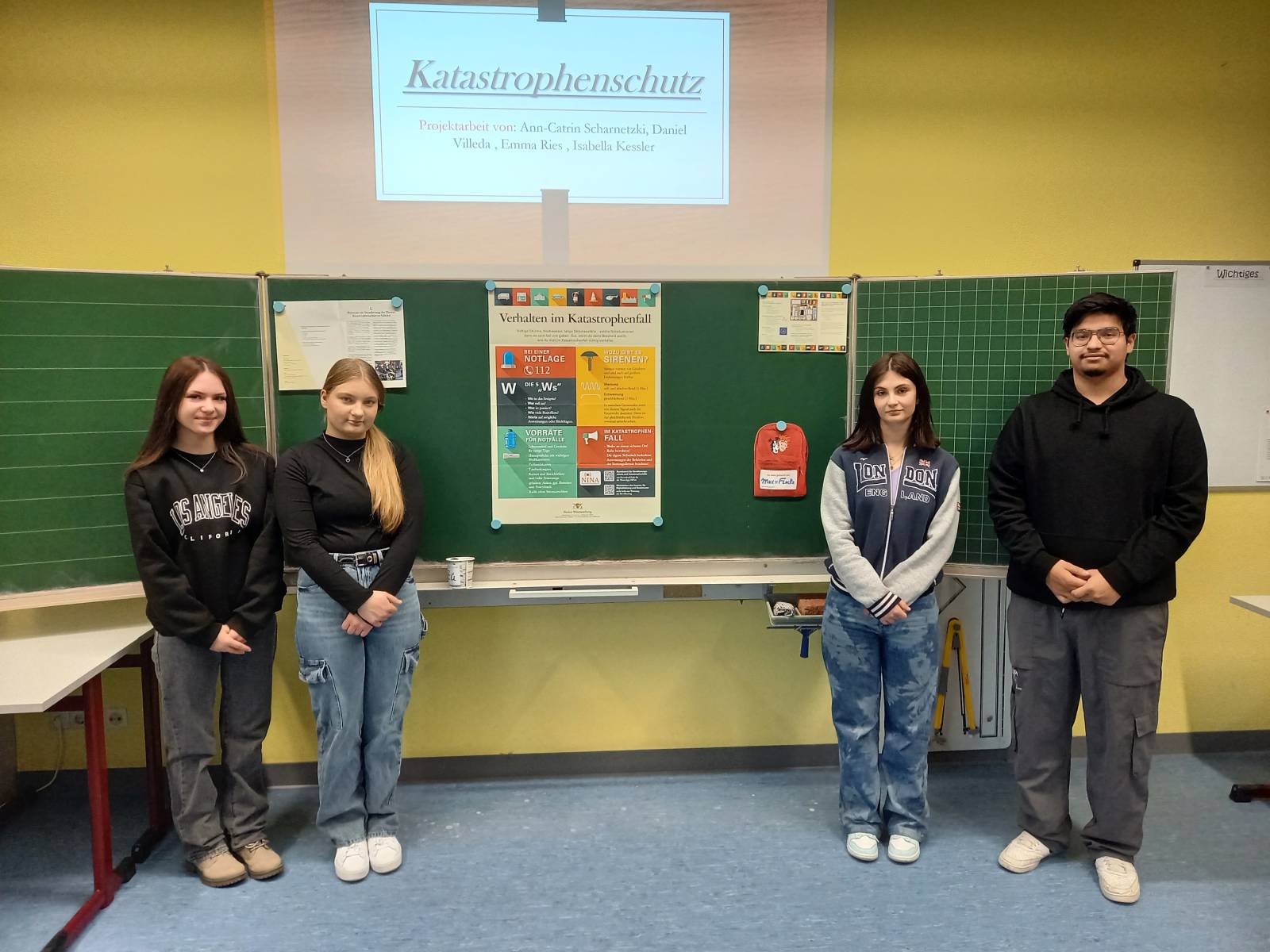 Bildungseinrichtungen sind angehalten, sich regelmäßig mit möglichen Gefährdungslagen zu beschäftigen. Ann-Cathrin, Emma, Daniel und Isabella übernahmen den Auftrag zur Planung, Durchführung und Auswertung eines Katastrophentages für ihre Projektarbeit. Was ist überhaupt unter einer Katastrophe zu verstehen? Welche Notlagen können in unserer Region eintreten? Welche Hilfsorganisatoren gibt es in Deutschland? Wie arbeiten professionelle und ehrenamtliche Rettungskräfte zusammen? Zunächst musste zur Klärung von solchen und ähnlichen Fragen eine umfangreiche Grundlagenarbeit geleistet werden. Daraus ergaben sich Ideen für die Umsetzung des Katastrophentages, der sich zurzeit noch in Planung befindet. Dessen Realisierung soll im Frühjahr stattfinden. Damit befindet sich dieses Vorhaben noch in der Umsetzungsphase, ist in der Schwebe und damit noch nicht abgeschlossen. Wir sind auf Ausgestaltung und Realisierung dieser Veranstaltung sehr gespannt.